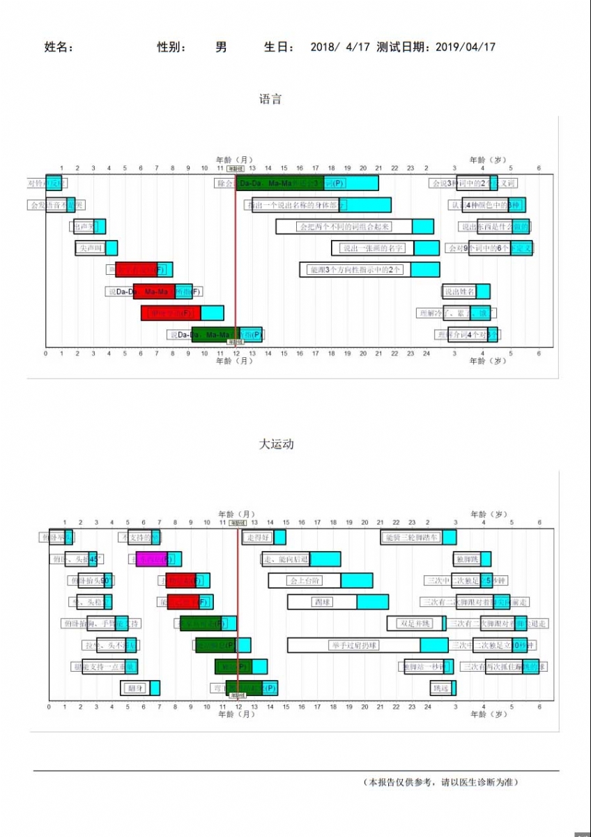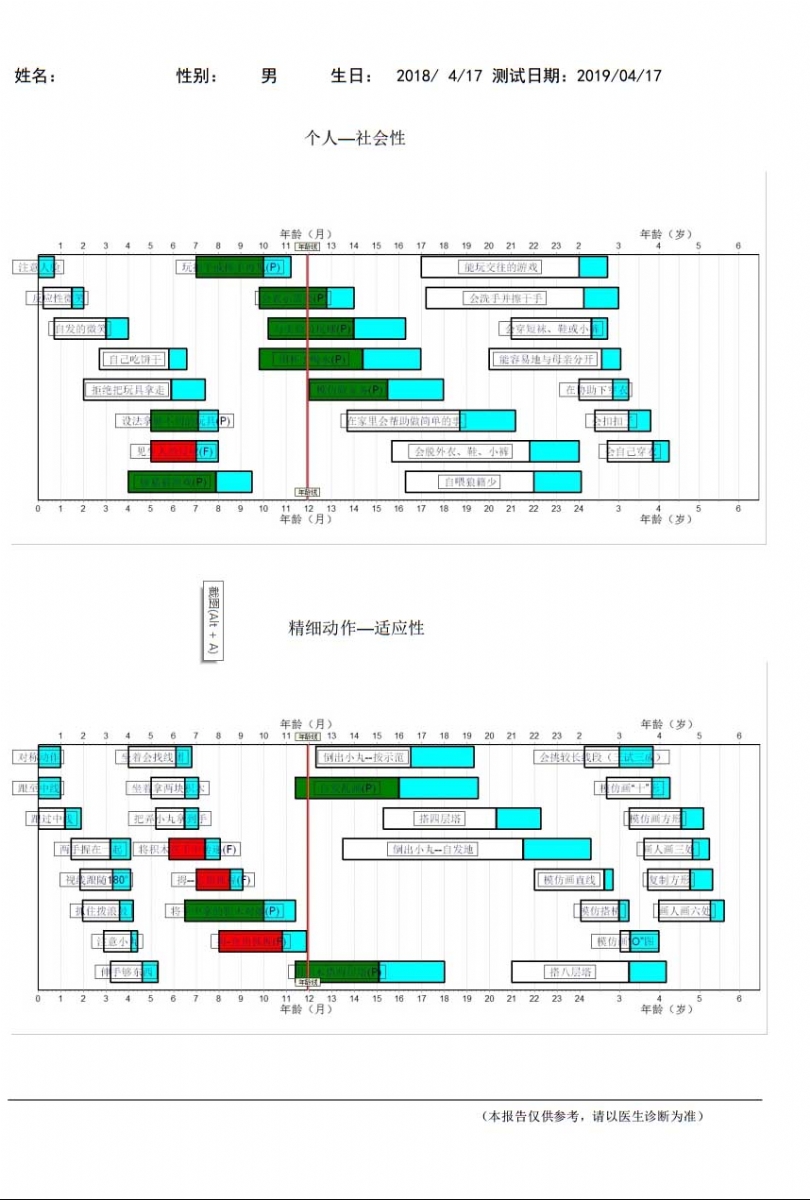 2、按照完成每個項目人數(shù)的25%、50%、75% 和90%作為標(biāo)準(zhǔn),將被查兒童與常模相比較,初步了解兒童的發(fā)育狀況。例如在某個年齡階段,90%的兒童都能掌握某項技能,而某被查兒童卻不能掌握,這一測驗結(jié)果表明該兒童在這方面的發(fā)展可能遲滯。通過一系列項目的測驗,丹佛發(fā)育篩查測驗?zāi)芴峁┰S多關(guān)于兒童心理發(fā)展?fàn)顩r的有價值的信息。