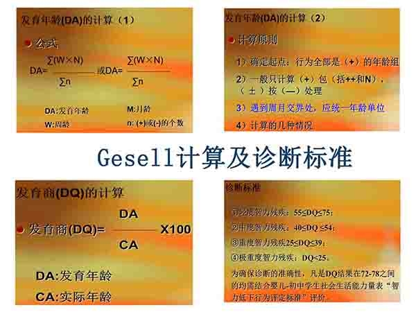 格賽爾(Gesell)智能診斷法適用于嬰幼兒。這種方法 從動作能、應物能、言語能及應人能4個方面進行檢查,并把4周、16周、28周、40周、52周、18個月、24個月、36個月作為8個“樞紐年齡”,即 在這些階段顯示出特殊飛躍進展。所測得的結果,以發(fā)育商數(shù)(DQ)來表示。